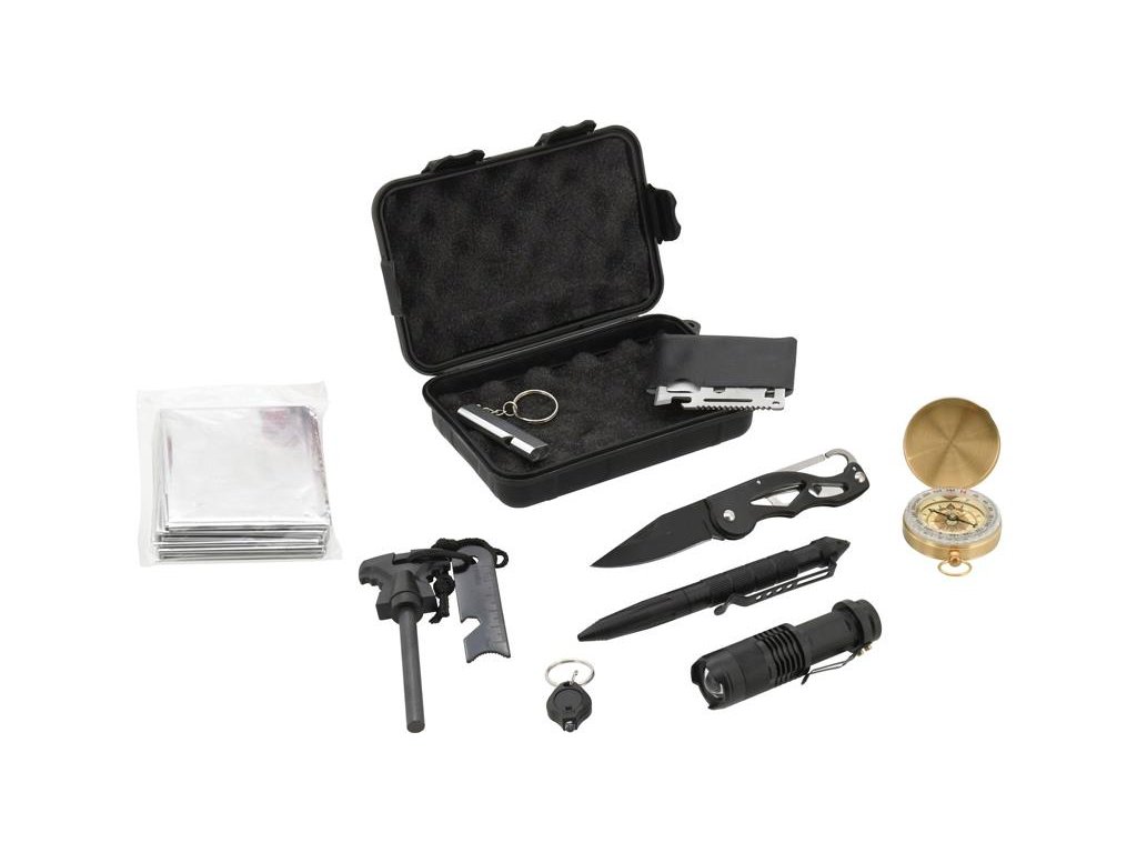 SOS sada je složena ze zavíracího nože s čepelí délky 6,5 cm, multifunkční karty, píšťalky, kompasu s otočnou stupnicí, bivakovací (izotermické) fólie, rozměrného křesadla pro zapálení ohně, přívěškem s LED osvětlením, celokovovým perem s průrazným hrotem a LED svítilnou napájenou AA baterií (není součástí balení) s nastavitelným kuželem vysoce výkonného světla. Vše je uloženo v ochranném, uzavíratelném pouzdře.