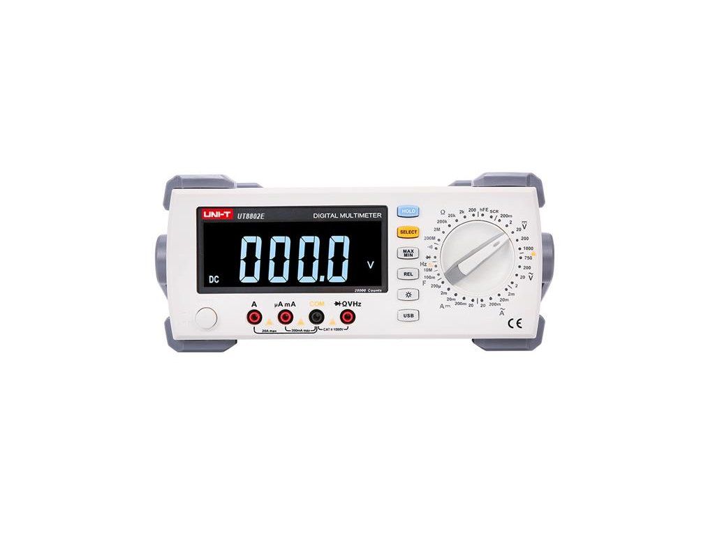 Stolní multimetr UNI-T UT8802ENa tento výrobek poskytujeme 3 roky záruku. UT8802 je stolní multimetr s ruční volbou měřeného rozsahu, zobrazitelnou hodnotou až 19 999, velkým LCD displejem s podsvícením, ochranou proti přetížení v celém rozsahu a unikátním designem. Přístroj lze použít k měření AC a DC napětí, AC a DC proudu, odporu, frekvence, kapacity, tranzistorů, hFE, diod (LED), SCR, spojitosti vedení apod.