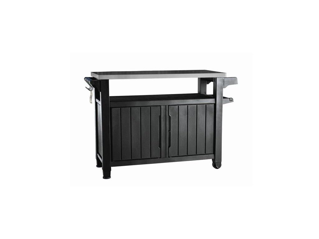 Grilovací stolek Unity XL značky Keter má kapacitu 207 litrů. Nerezová pracovní deska, praktická rukojeť s háčky na pověšení utěrek a kolečka pro přemisťování stolku dohromady vytvářejí dokonalé prostředí pro venkovní grilování.