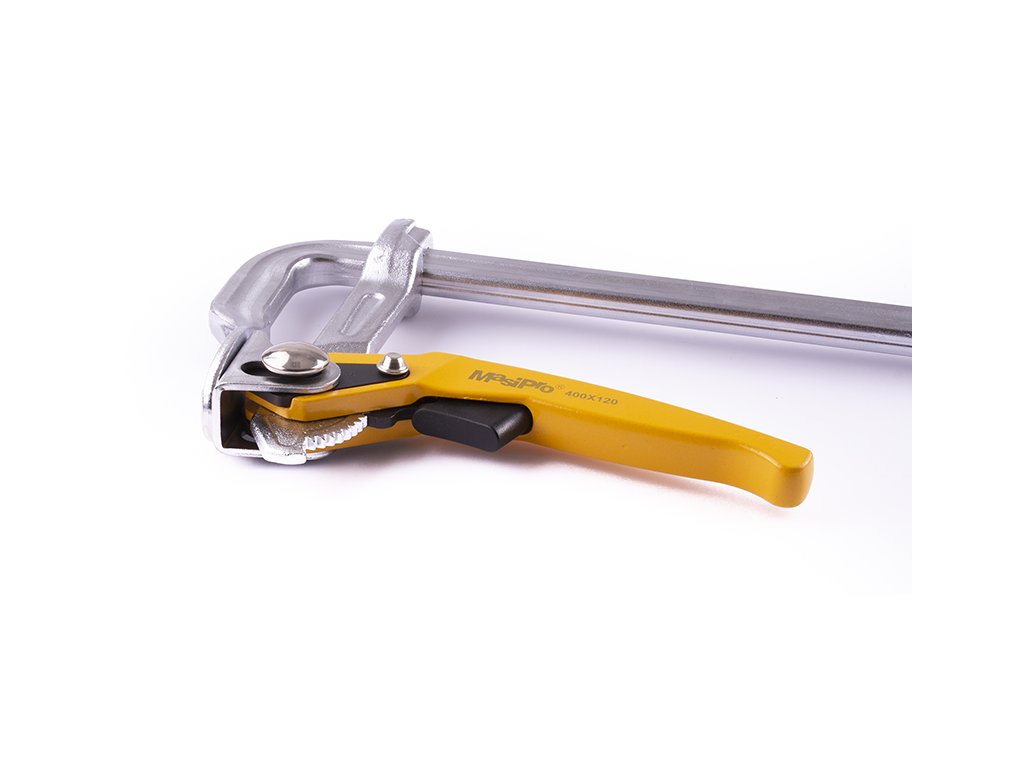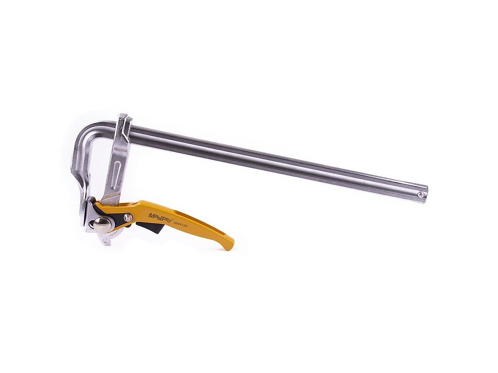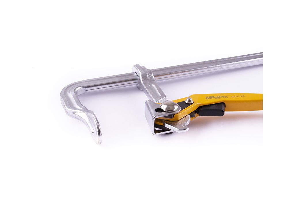 SPECIFIKACECelokovová konstrukce.Kované pevné rameno s přítlačnou destičkou.Délka čelistí 120 mm.Pákový rychloupínací mechanismus se zubovou pojistkou.Ráčnový systém.Oproti běžné šroubovací svěrce 5x rychlejší.Upínací síla do 8,7 kN.Rozměr: 400x120 mmPohyblivá čelist pro přesné přizpůsobení tvaru svíraného materiálu.
