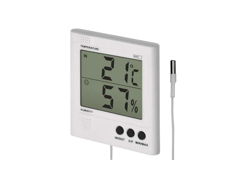 Teploměr EMOS RS8471Digitální teploměr s drátovou sondou. Teploměr zaznamenává vnitřní a venkovní teplotu, vnitřní vlhkost, min. a max. teplotu a varuje před námrazou. Sonda teploměru má délku 2 m.