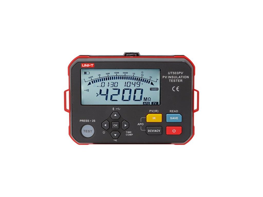 Na tento výrobek poskytujeme 3 roky záruku. Digitální tester izolačního odporu UT503PV lze použít k měření izolačního odporu s fotovoltaickým napájením (maximální: 1000 V DC) a konvenčního izolačního odporu (bez napájení) a automatické identifikaci střídavého / stejnosměrného napětí. Má několik funkcí, včetně: měření fotovoltaického izolačního odporu bez solárního panelu při výpadku napájení / zkratu nebo v noci, odstupňování napětí, přenosu Bluetooth, automatického vybíjení, varování před vysokým napětím, dálkově ovládaného provozu testovacího vodiče dalších. UT503PV se běžně používá k testování izolačního odporu pro různá zařízení, jako je fotovoltaický panel, akumulátorový systém skladování energie atd.