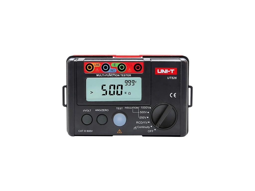 Tester multifunkční UNI-T UT526Přístroj UT526 je univerzální měřící a testovací přístroj pro provádění revizí elektrických spotřebičů. Umožňuje kontrolu vybavení proudových chráničů, měření odporu zemnicí smyčky, měření izolačního odporu, kměření kmitočtu AC napětí a měření DC a AC napětí. Přístroj je nově navržen v odolném krytu s novými analogovými, digitálními a mikroprocesorovými obvody.