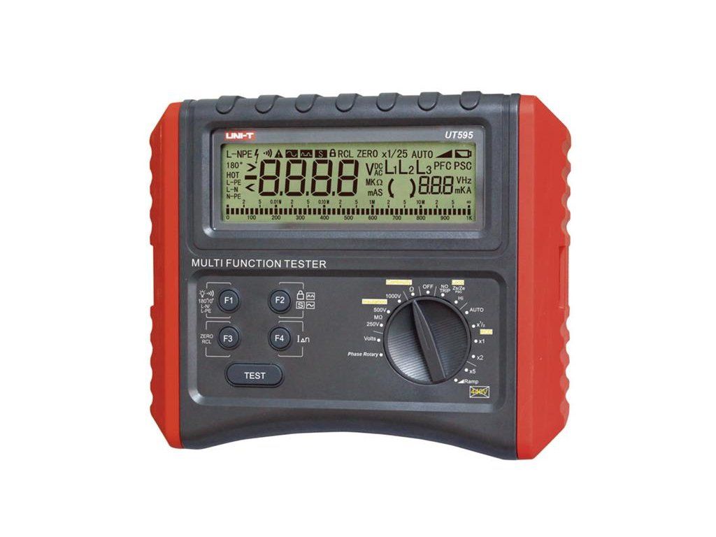 Tester multifunkční UNI-T UT595Přístroj UT 595 je univerzální měřící a testovací přístroj pro provádění revizí elektrických spotřebičů. Umožňuje automatizovanou kontrolu vybavovací doby proudových chráničů, měření svodových proudů, měření impedance zemnicí smyčky a spojitosti uzemnění, měření izolačního odporu, měření kmitočtu AC napětí a měření DC a AC napětí, pořadí fází v třífázových rozvodech.