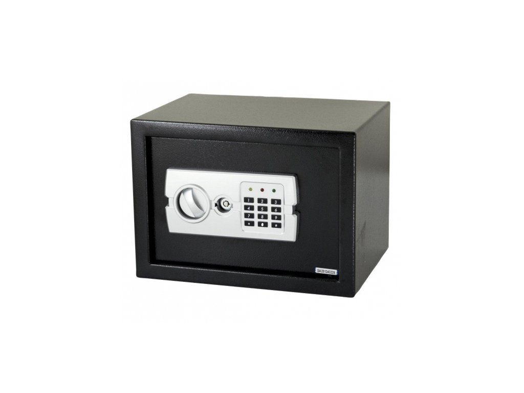Trezor G21 (350x250x250mm)Digitální trezor G21 uchová vaše peníze, šperky, cestovní pasy, fotoaparáty a další cennosti v naprostém bezpečí. Trezor je možné nejen zazdít do zdi, ale díky 4 otvorům na spodní straně také přichytit k podlaze, nebo jej nechat volně stát. Na zadní straně trezoru jsou umístěny 4 otvory, které jej umožňují přichytit také na zeď. Tyto domácí trezory jsou v moderní černé barvě a mají kvalitní kovové provedení. Uvnitř trezoru se nachází jedna police, prostor je tedy rozdělen do dvou přihrádek. Elektronický zámek je na PIN-kód, který vám umožní velmi snadnou obsluhu. Určete si 3-8 místný číselný kód a mějte všechny cennosti bezpečně pod zámkem. V případě nouze je k trezoru dodáván klíč, kterým je možné trezor otevřít.