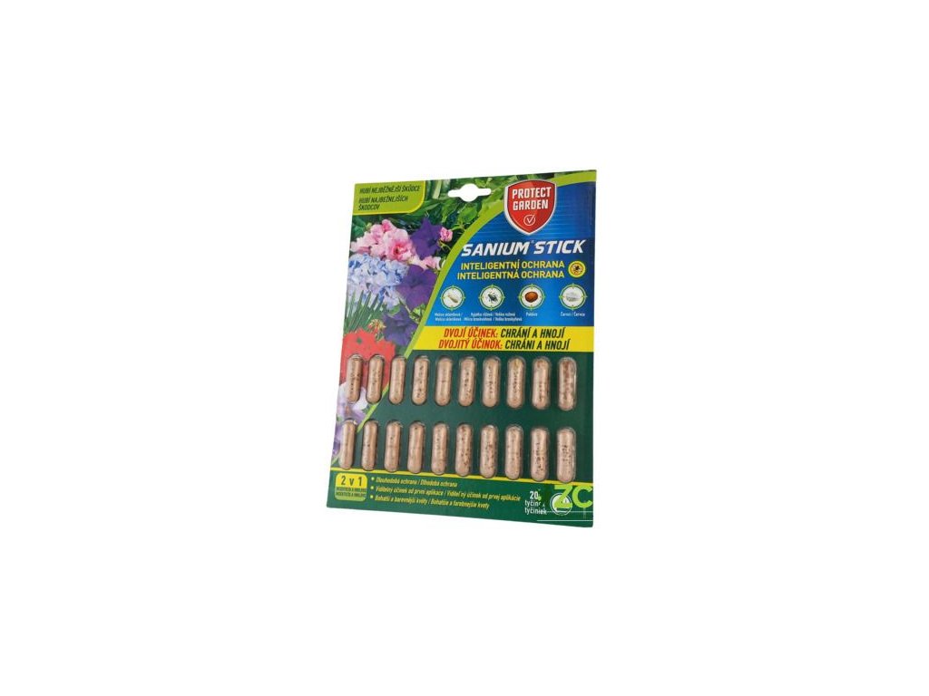 Sanium Stick z řady PROTECT GARDEN je určený k ochraně pokojových okrasných rostlin pěstovaných v květináčích a truhlících v bytě a zimních zahradách proti savým škůdcům - mšice a molice. Účinná látka flupyradifuron je snadno přijímána kořeny rostlin a je dále distribuována do nadzemních částí. Přípravek rovněž dodává rostlinám všechny základní živiny a obsahuje specifické látky (výtažek z mořských řas, huminové látky, extrakt z cukrovky), které zlepšují celkový vzhled rostliny (zelená barva, olistění, rychlejší růst, lepší kvetení). První příznaky účinku na mšice jsou viditelné za 7 dní, na molice za 14 dní. Účinná látka flupyradifuron účinkuje až 9 týdnů.