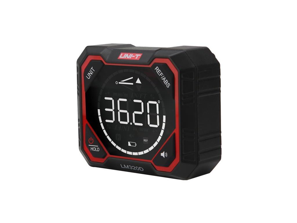 Digitální úhloměr LM320D je lehký a přenosný úhloměr s odolným rámem z hliníkové slitiny, což je zárukou odolnosti při práci. Umožňuje přesně změřit sklon roviny, nahrazuje vlastně vodováhu pro práce ve stavebnictví - při stavbě střech, podlah, kanalizací. Je vybaven displejem s vysokým rozlišením a automatickým otáčením obrazovky, který podporuje celý rozsah měření 4×90°. Zařízení poskytuje údaje o úhlu náklonu v reálném čase a je vybaveno magnetickou základnou pro snadné a stabilní polohování. Základní jednotkou měření je stupeň (°), je však možné zvolit i jiné jednotky: procenta (%), milimetry na 1m délky nebo palce na 1 stopu. Je široce používán v oblasti strojírenství, stavebnictví a mechanických instalací. Přístroj má zabudovaný lithiový akumulátor 3,7V, 1000mAh, který se nabíjí v přístroji přiloženým kabelem USB-C .