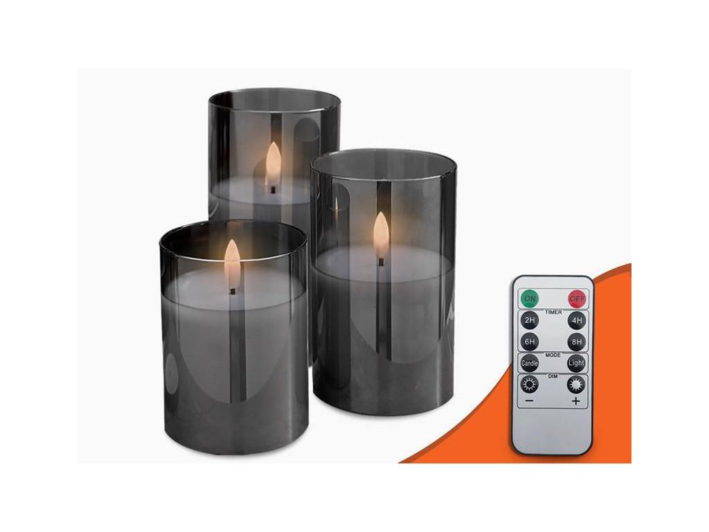 Jedinečné a elegantní dekorativní LED svíčky z kouřového skla jsou perfektním řešením pro každého, kdo chce do svého interiéru vnést trochu kouzla a tepla. Naše sada obsahuje tři svíčky různých výšek a dálkový ovladač, který vám umožní pohodlně a rychle přizpůsobit osvětlení vaší náladě a potřebám.
